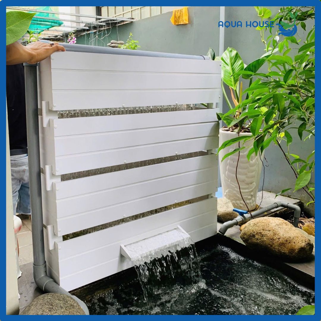 Xếp 3 tầng chồng lên nhau, đảm bảo máng xả tràn thẳng hàng. Kết nối ống mưa (phi 60-42mm) với máy bơm (lưu lượng 10,000-30,000L/h tùy hồ).