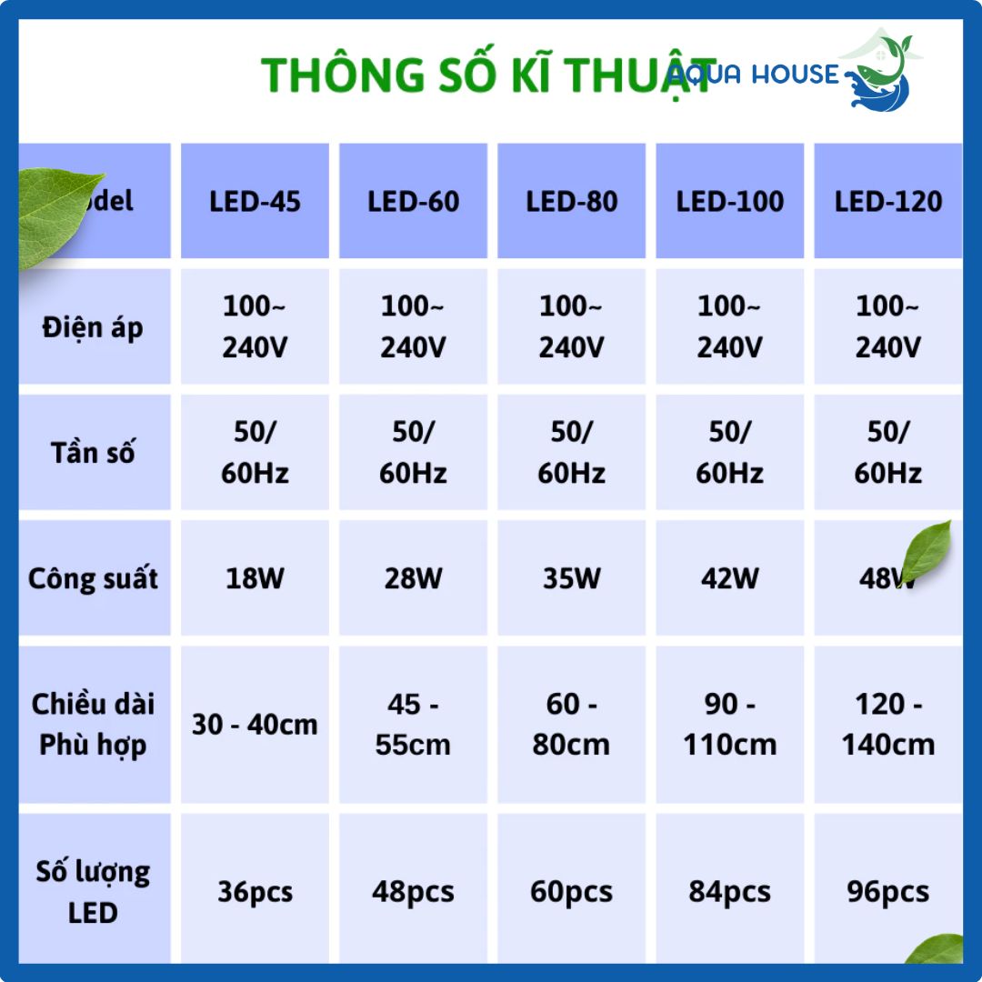 Thông Số Theo Từng Model Đèn Máng Thủy Sinh