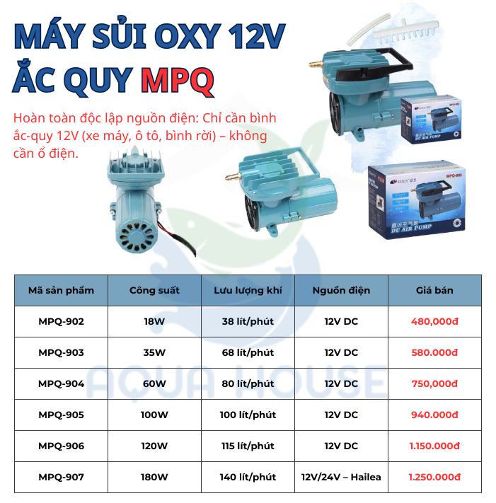 Máy Sủi Oxy Tích Điện từ nhỏ tới cho cá cảnh, cá Koi, hải sản, nhà hàng, bán dạo, vận chuyển lớn: