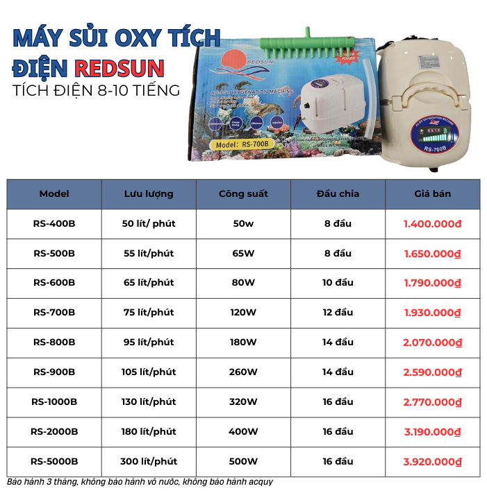 Dòng máy sủi oxy tích điện, 8 tiếng, công suất lớn, sủi nhiều cá: